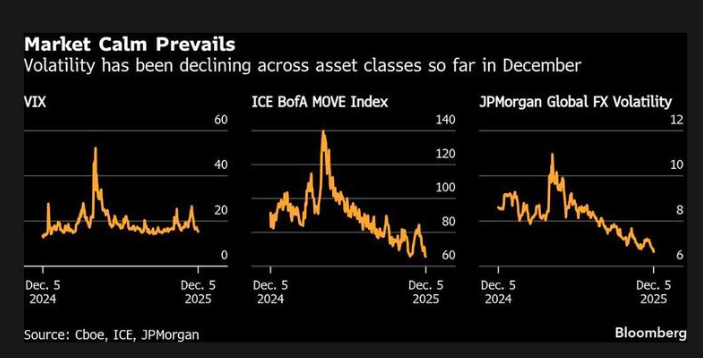 Or, je pense que tous ces éléments positifs sont bien connus et intégrés dans les marchés aujourd’hui. Non seulement la bourse américaine est chère, mais en plus la volatilité y est faible. Comme les graphiques suivants le montrent, la volatilité est faible sur les actions ( VIX sous les 20), mais aussi sur les taux obligataires et les taux de change ( MOVE et volatilité FX en forte baisse).