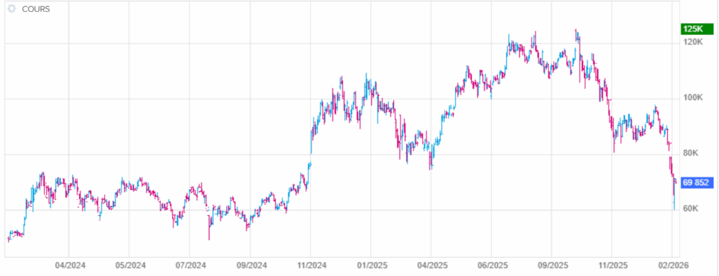 Depuis son plus haut de septembre 2025 à 125k $, il a baissé de moitié jusqu’à la séance de vendredi dernier.Comme les volumes ont explosé en 2025, il est très probable que la vaste majorité des investisseurs soient perdants aux niveaux actuels du BTC. Je n’ai vu que deux éléments d’explication convaincante de cette baisse. D’une part, traditionnellement, le BTC est associé aux valeurs technologiques, et on a vu une baisse ces derniers mois des valeurs américaines de logiciels (au profit des semi conducteurs par exemple). D’autre part, la valeur refuge préférée des investisseurs a été l’or, qui a atteint des niveaux record, au détriment du BTC.